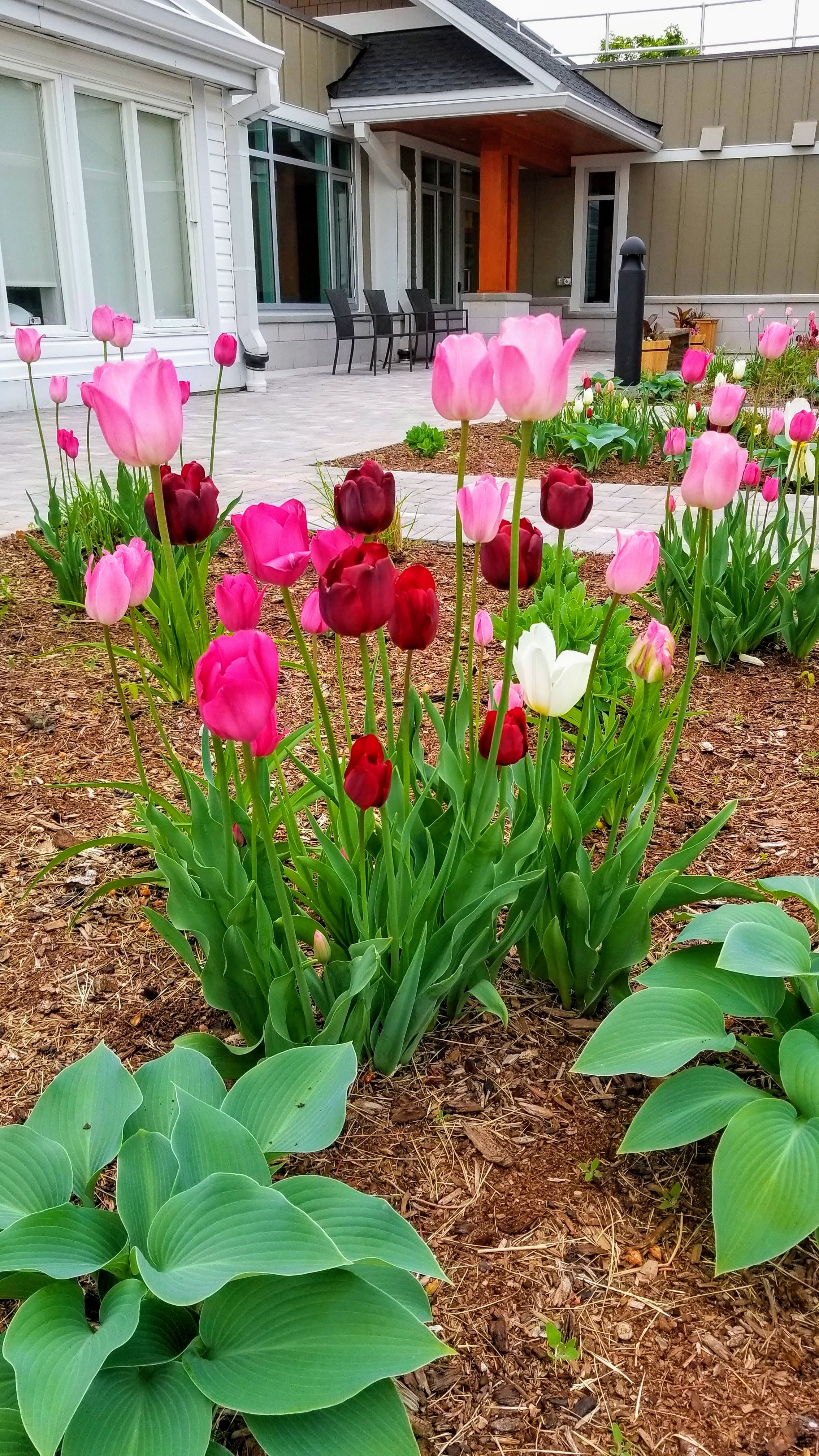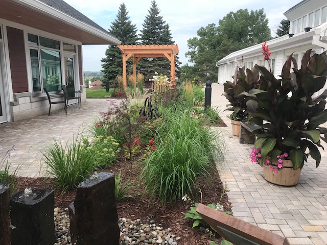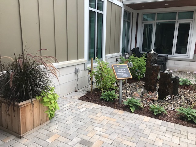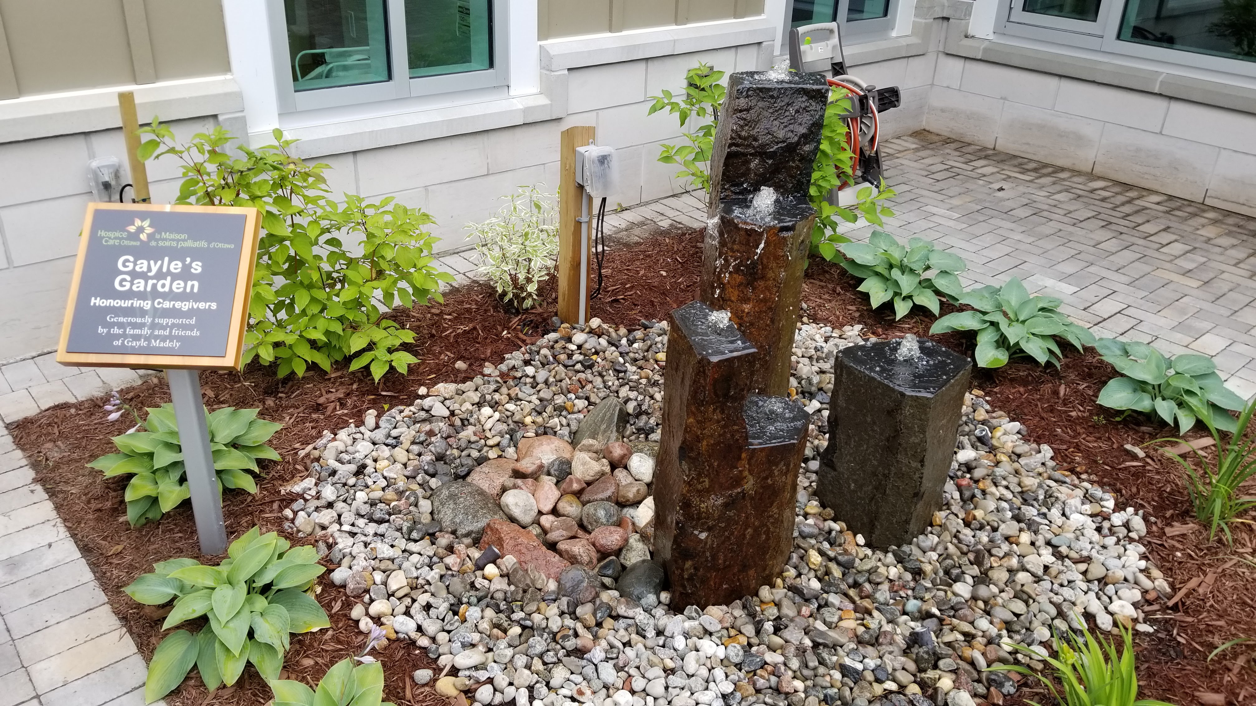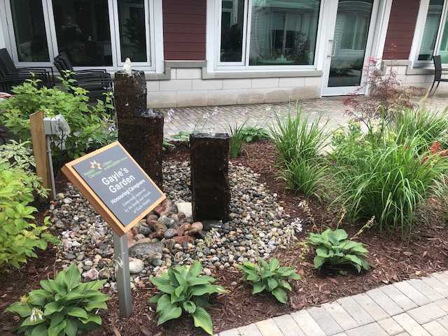 As Water Garden Lovers…we all know the multiple benefits of water features and gardens so this year, in partnership with the Kanata-March Horticultural Society (KMHS), we pooled resources to donate the installation of three garden beds that make up the courtyard garden as part of Gayle’s Gardens at the newly expanded Ruddy-Shenkman Hospice in Kanata. The development of these gardens is integral to the care offered by the hospice. It is proven that “healing gardens” can be therapeutic in relieving stress and offering a sense of peace and wellness. The focal point of the largest bed is a collection of five bubbling columns. The vegetation design provides four-season interest and includes “soft colours and textures to promote healing, peacefulness and relaxation”.